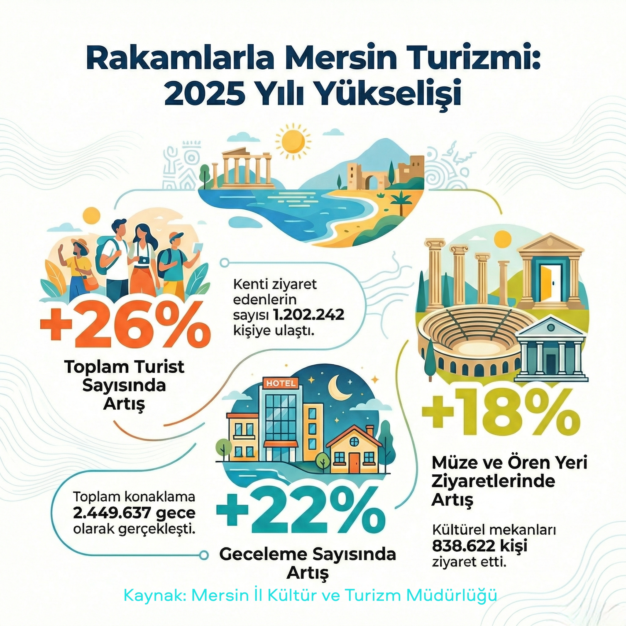 Kültür ve Turizm Bakanlığı’nın Turizm İşletme Belgeli Tesis İstatistikleri’ne göre, Mersin'deki toplam turizm işletme belgeli 114 tesiste toplam 10 bin 285 yatak kapasitesi ve önemli bir kısmı A Grubunda hizmet veren 147 seyahat acentası bulunuyor.Mersin İl Kültür ve Turizm Müdürlüğü, 2025 yılının 11 aylık döneminde Mersin’de gerçekleşen toplam geceleme sayısının bir önceki yılın aynı döneminden yüzde 22'lik artışla 2.449.637 olarak belirliyor. Mersin’e gelen turistlerden müze ve Ören Yerlerini ziyaret edenlerin sayısı ise önceki yılın eş döneminden yüzde 18'lik artışla 838.622 kişiye ulaştı.